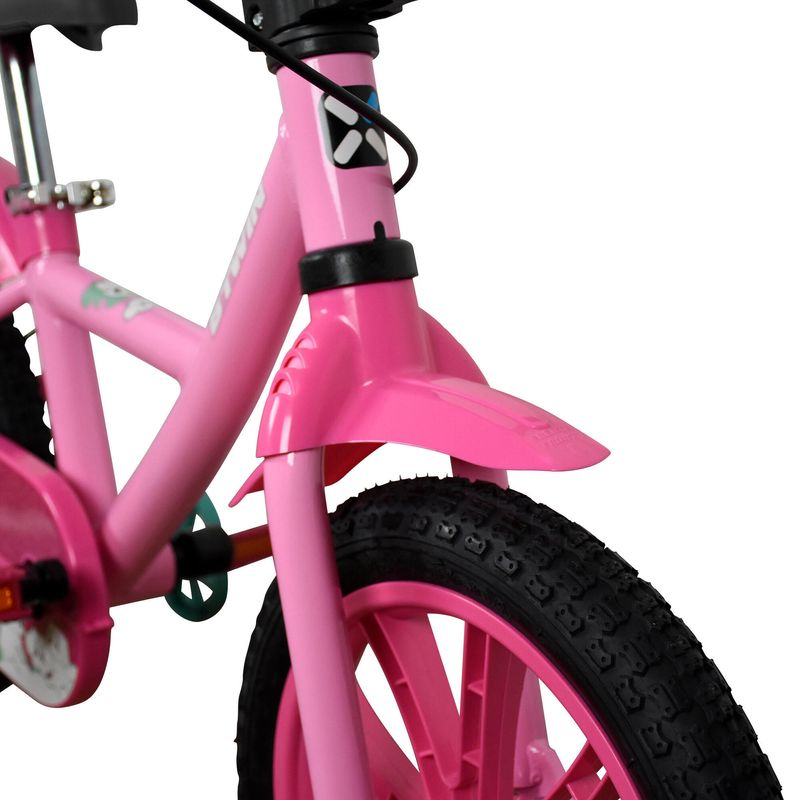 Rodas em plástico com fixação por porca e rolamentos. Rodinhas laterais: Em plástico, com braços em plástico reforçado. As rodinhas têm um sistema de fácil ajuste, facilitando a mudança de altura das rodinhas em relação ao chão, no processo de aprendizado do equilíbrio pela criança.