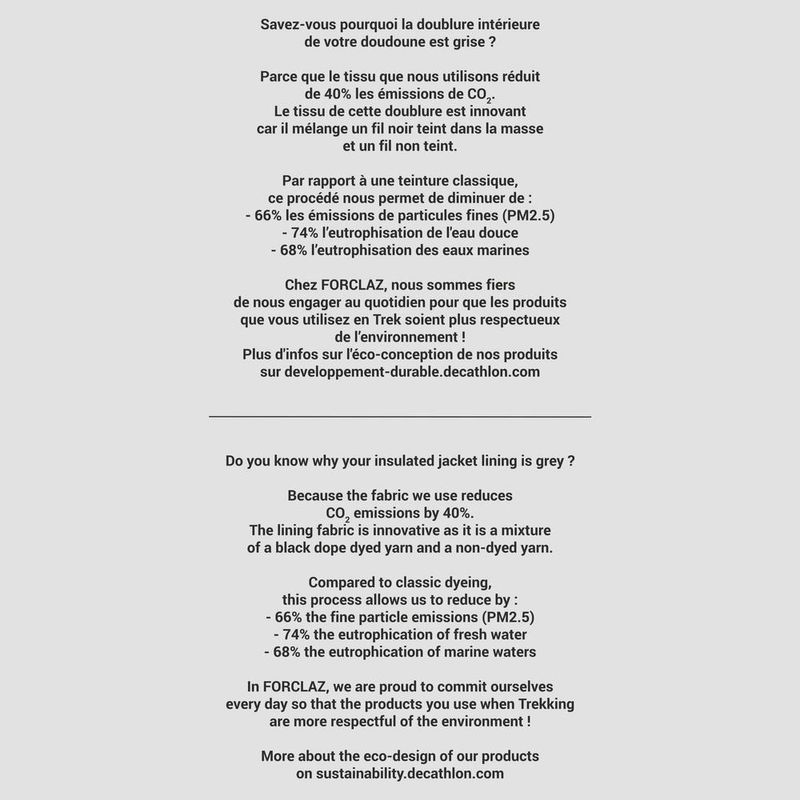 Em novembro de 2017, 6 praticantes de Trekking (4 homens e 2 mulheres) acompanhados por uma parte da equipe de concepção da Forclaz testaram este casaco de penas nos Alpes do Sul de França durante 4 dias. Assim, foi possível efetuar alterações finais e validar o casaco para uma utilização em prática de trekking em montanha.