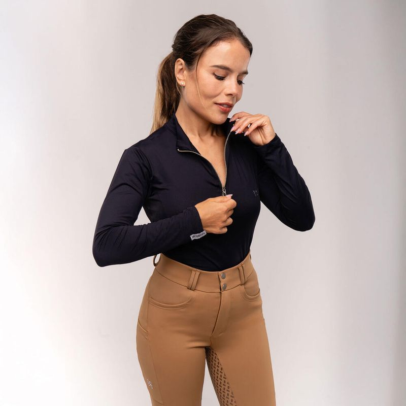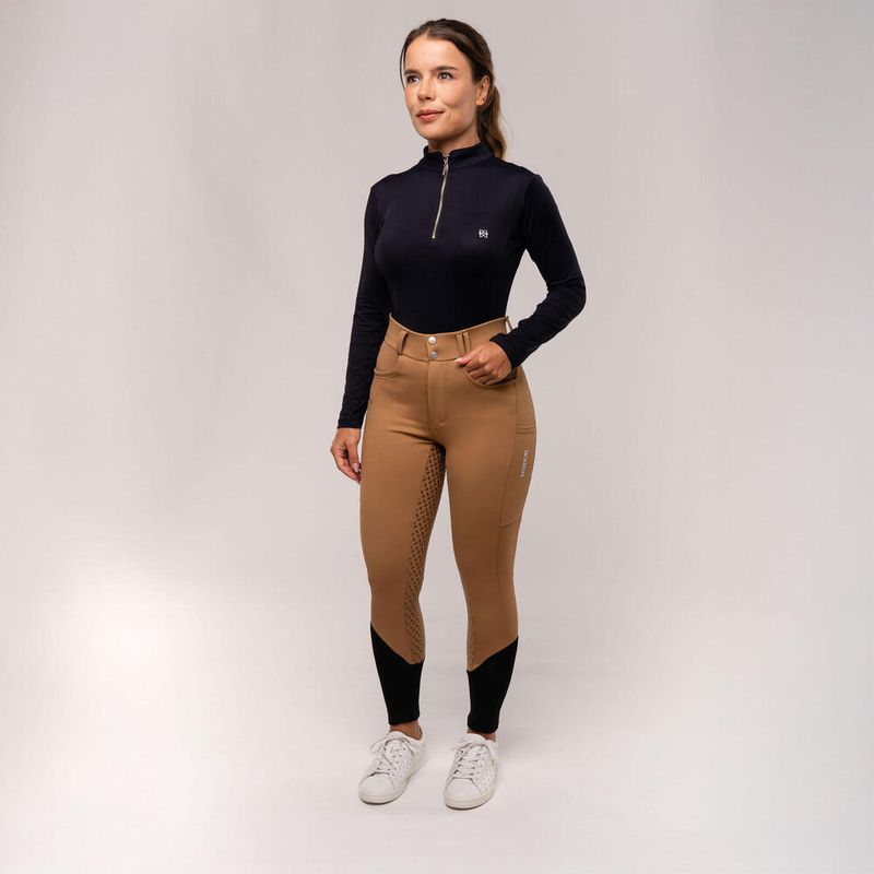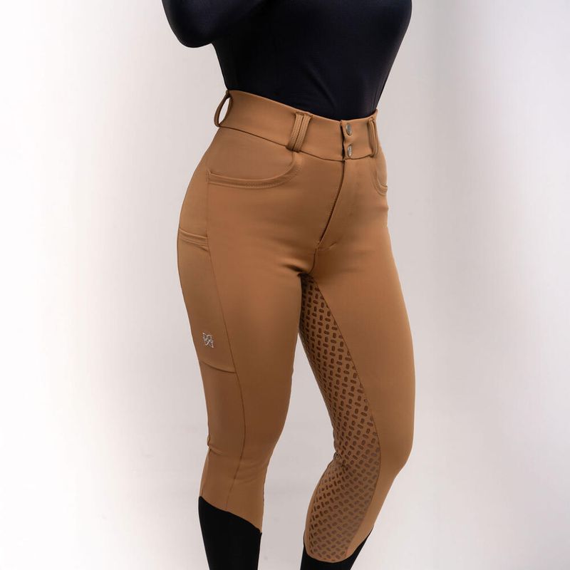 Calça dupla face caramelo com compressão, secagem rápida e máximo conforto para cavalgar com estabilidade. Desempenho e elegância com a calça dupla face caramelo. Modela o corpo, seca rápido e oferece aderência total na sela com conforto o dia todo.