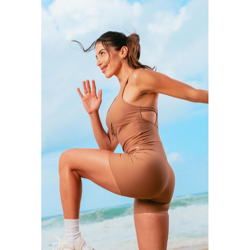 A peça possui modelagem curta, com decote arredondado e abertura nas costas com detalhe cruzado, trazendo um visual moderno que combina frescor e liberdade de movimento.