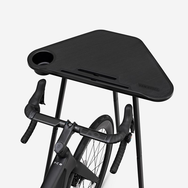 Graças ao seu design, a mesa para o Rolo de Treino Van Rysel integrar-se-á perfeitamente na tua bicicleta. Junto da bicicleta poderás colocar o teu computador e todos os objetos necessários para a prática com rolo de treino. O design desta mesa permite também colocar uma ventoinha na sua parte inferior, sem cortar o fluxo de ar, e, desse modo, assegurar a melhor experiência.A sua forma triangular permite-te utilizar o canto de uma divisão, se o desejares!