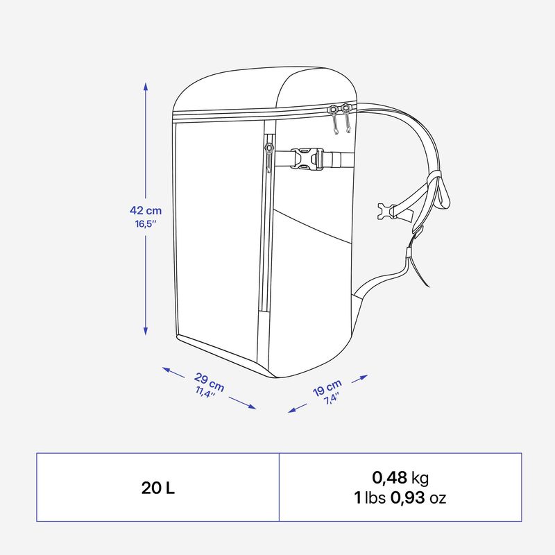 A nossa equipa ecodesenhou esta mochila isotérmica Ice Compact 20 L para as suas bebidas e alimentos na caminhada. Ideal para os seus desejos de liberdade. A nossa motivação? Apresentar-lhe uma mochila isotérmica confortável e muito funcional para aproveitar as caminhadas e manter frescos os seus alimentos! O volume da mochila é de 20 litros.