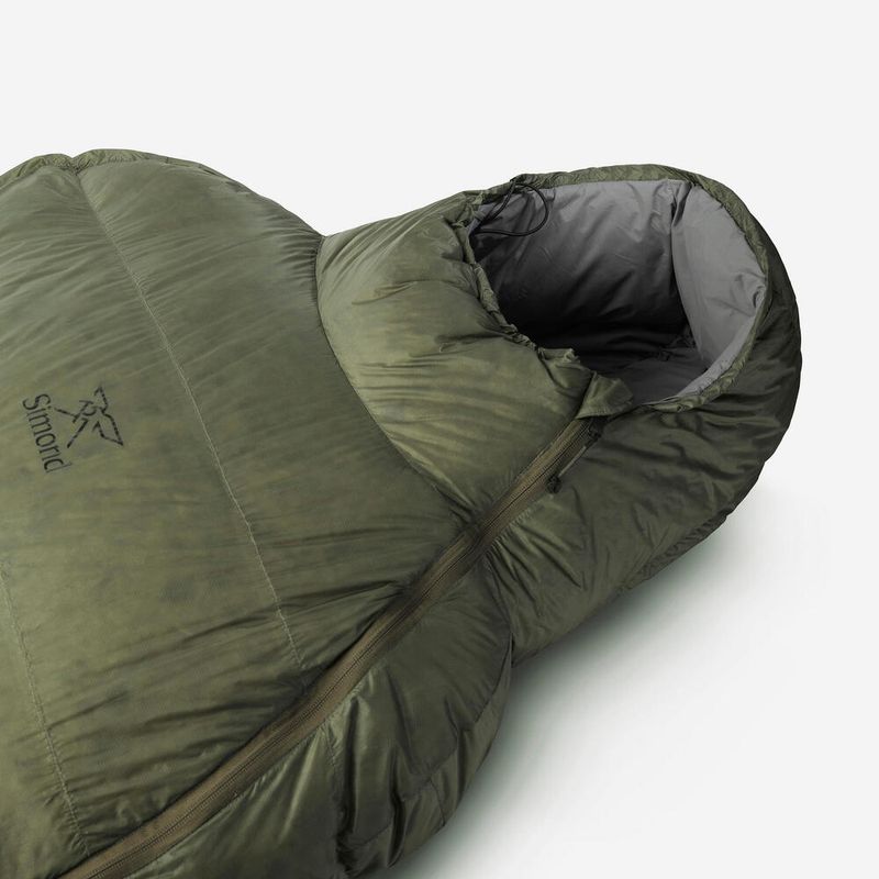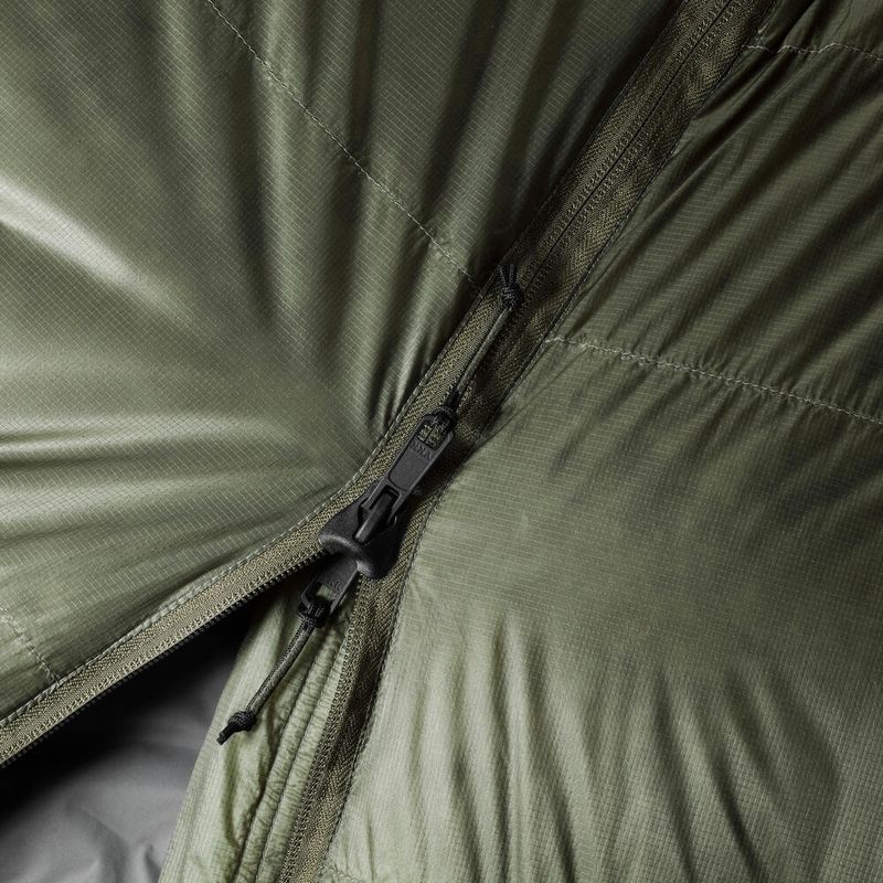 Na parte superior do saco de dormir, usamos penugem de pato 800 CUIN certificada pela RDS (260 g no tamanho L). Para a parte inferior, escolhemos 700 CUIN de penugem reciclada (235 g no tamanho L). Em todos os casos, é uma mistura de 90% de penugem de pato e 10% de penas. A penugem é distribuída em partes de 4 cm de altura, separadas por divisórias em mesh posicionadas em Z, a fim de evitar pontes térmicas.