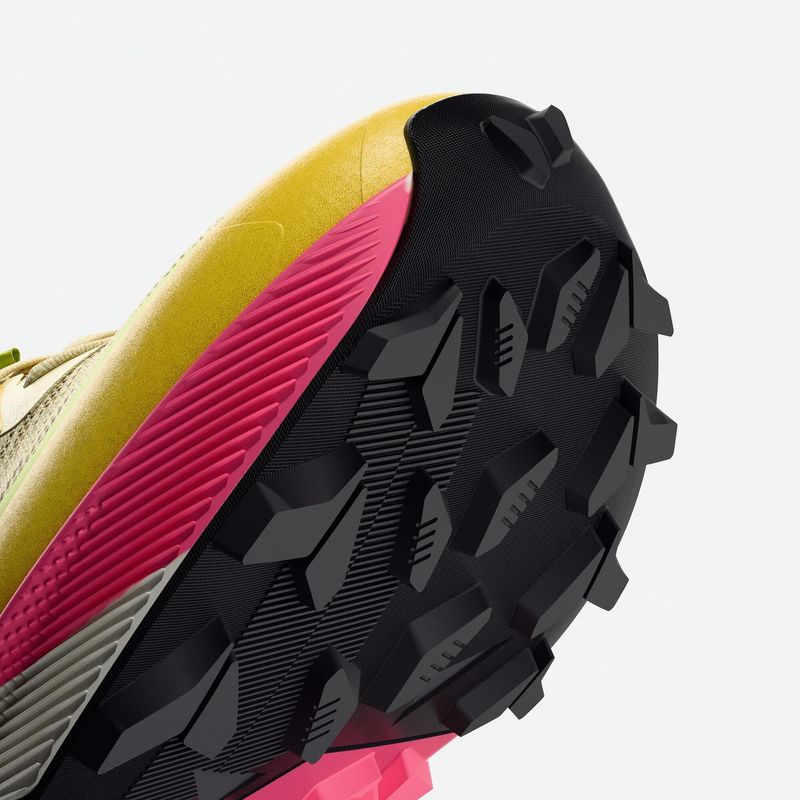 A nova espuma foi projetada para absorver os impactos gerados em terrenos irregulares sem comprometer o retorno de energia. O resultado é uma passada mais suave, estável e dinâmica, mesmo em trilhas técnicas, subidas íngremes e descidas acentuadas.